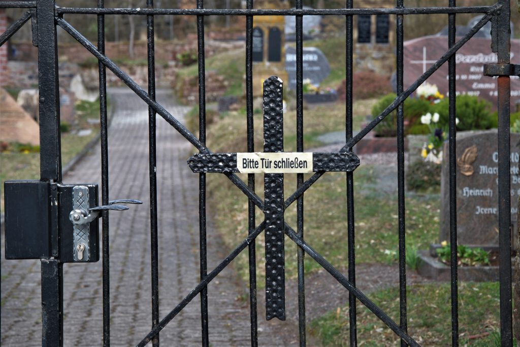 Im Hintergrund sieht man den Friedhof mit den Gräbern. Im Vordergrund ist eine Eisentür mit einem Kreuz abgebildet und quer über dem Kreuzesbalken befindet sich die Aufschrift: „Bitte Tür schließen“.