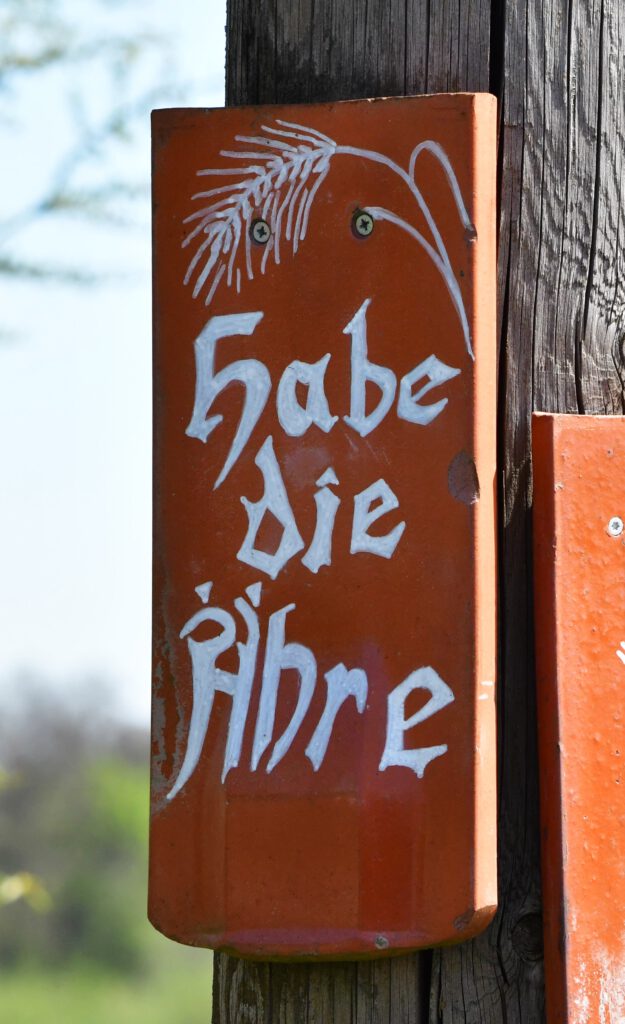 Bei einem Spaziergang fand ich am Grundstücksrand eines Landwirts eine beschriftete Dachpfanne mit der Aufschrift: “Habe die Ähre“.